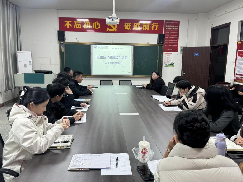 为进一步强化班级管理效能,搭建班主任经验交流平台,凝聚育人共识,11月23日,人工智能学院举办“班主任说班级”主题活动。人工智能学院院长胡德洪、副院长陈露及全体班主任、辅导员参与活动。5位班主任代表围绕班级建设实践、特色管理方法、育人案例分享等内容展开深入交流,分享经验,共话成长。