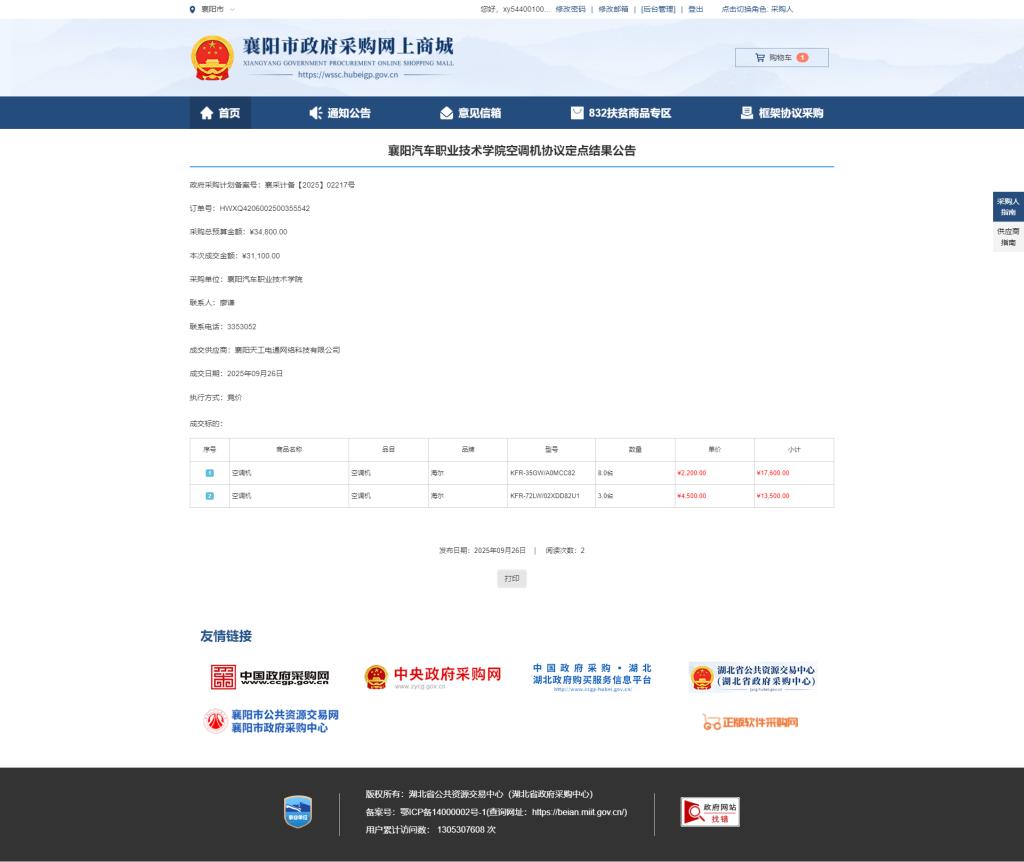 襄阳汽院办公设备采购3-1(空调)协议定点结果公告
