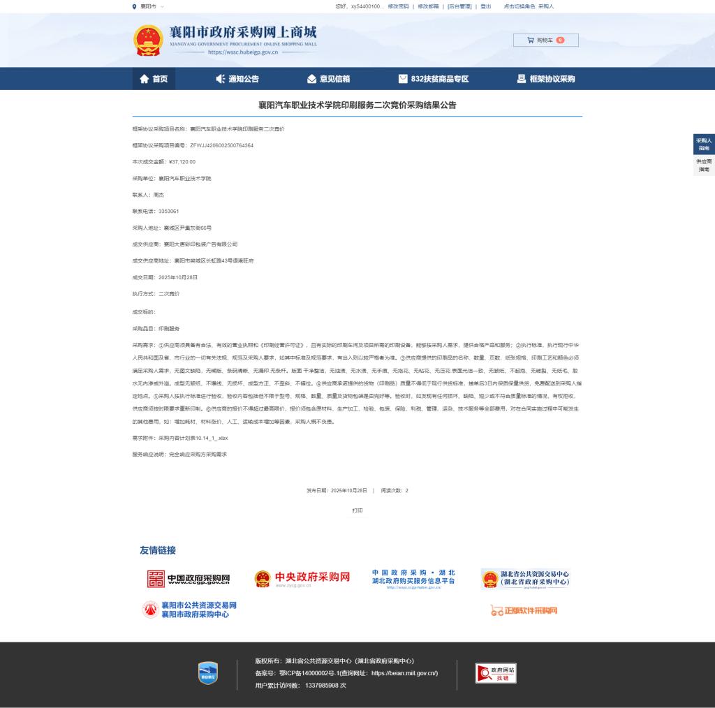 襄阳汽院采购印制职业技能评价相关用品采购结果公告