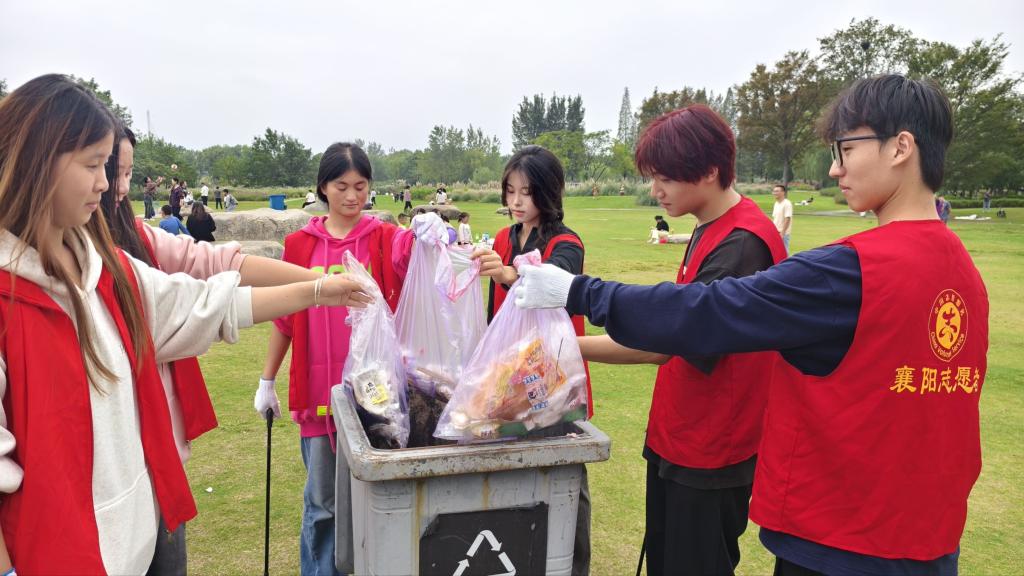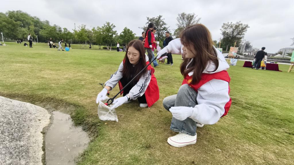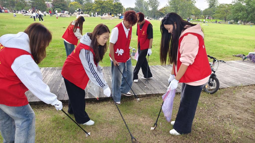 志愿者们身穿红马甲,佩戴交管学院徽章,在公园北门广场整齐列队。志愿者们手持垃圾夹、扫帚、垃圾袋等工具,分组对公园主干道、绿化带、休闲广场、湖岸栈道等区域展开“地毯式”清理。从烟头、纸屑到塑料瓶、枯枝落叶,志愿者们弯腰俯身,逐一拾起,不放过任何卫生死角。