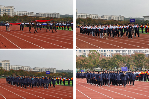 伴随着激昂的《运动员进行曲》,国旗护卫队率先迈着铿锵有力的步伐入场,五星红旗迎风飘扬,彰显出家国情怀与崇高使命;校旗与院旗方阵紧随其后,步伐坚定,展现出学院的荣誉与担当;各专业代表队身着统一服装,精神抖擞、口号嘹亮,尽显青年学子的蓬勃朝气;教师裁判方阵神情庄重、步履稳健,传递出公正执裁、严谨规范的赛事理念。
